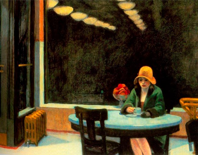 «Поэт пустых пространств», «архитектор одиночества», «мечтатель без иллюзий», урбанист, предшественник поп-арта — как только не называли Эдварда Хоппера на протяжении всего XX века. Его картины, наполненные ожиданием, экзистенциальной тоской, неким предчувствием, идеализирующие одиночество своими смыслами и символами, созданные в начале ХХ века, удивительным образом актуализировали события и переживания людей века XXI. Эта дама, в одиночестве отпивающая горячий чай в кафе-автомате, когда темнота за окном спустилась ранее привычного, и обогреватель присутствует как неотъемлемый атрибут надвигающейся зимы – яркий символ позднего октября. Все мы немножко в депрессии, понимая, что весна, солнце и тепло наступят лишь через полгода. Однако осень, зима и ранняя весна пролетают столь же быстро, как и теплое лето – это лишь момент жизни, ее восприятия.
