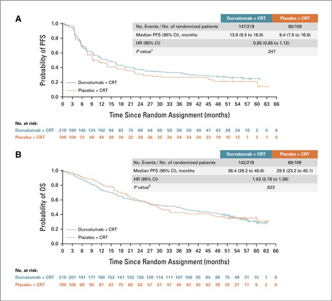 Увы, исследователям не удалось продемонстрировать преимуществ добавления иммунотерапии к стандартной ХЛТ: достоверной разницы не было ни в ВБП (HR 0,85 [95% CI 0,65-1,12]; P=0,247), ни в OВ (HR 1,03 [95% CI 0,78-1,39]; P=0,823); при этом медиана ОВ в группе Д в PACIFIC-2 оказалась ниже, чем в PACIFIC (36,4 против 47,5 мес.), тогда как группа плацебо показала схожие результаты (29,5 против 29,1 мес.). OВ за 24 месяца составила 58,4% в группе дурвалумаба против 59,5% в группе плацебо. Частота объективных ответов – 60,7% против 60,6% (95% CI 215,2-16,3%; P=0,976).