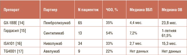 В небольшом одногрупповом исследовании 2 фазы (n=13) применение синтилимаба в комбинации с четырехвалентной HPV-вакциной при рецидивирующем РШМ продемонстрировало ЧОО, равную 54%, при медиане ВБП 7,2 мес., а 1-летняя ОВ составила 61,5%. Интересно, что авторы не использовали какую-либо специально разработанную терапевтическую вакцину – вместе с ниволумабом вводилась профилактическая вакцина «Гардасил» [15]. Терапевтическая вакцина ISA101, которая представляет собой синтетические пептиды E6 и E7 ВПЧ16, в комбинации с ниволумабом в исследовании II фазы (n=34) показала ЧОО 33%, медиана общей выживаемости составила 15,3 мес. [16]. Рекомбинантная векторная вакцина TG4001, кодирующая синтез E6, E7 и IL-2, в комбинации с анти-PD-L1 препаратом авелумабом продемонстрировала не столь впечатляющие результаты в лечении ВПЧ-ассоциированных опухолей: в открытом исследовании II фазы (n=43, 21% – РШМ) ЧОО составила 22%, а медиана ВБП всего 2,8 мес. При этом в немногочисленной когорте РШМ показатель ответ был у 33% пациенток [17].